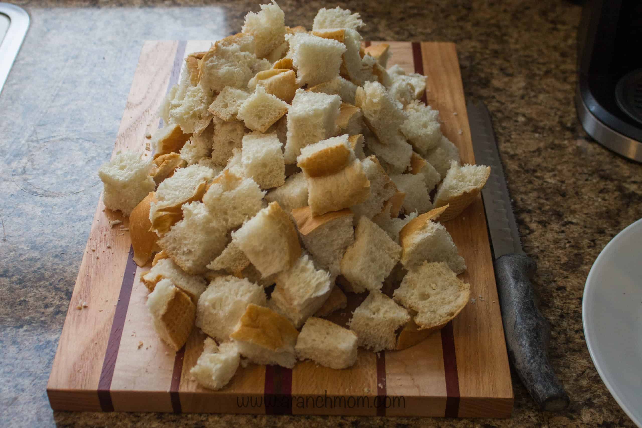 Using an electric bread knife really speeds up the bread-cutting process. Either way, cube the bread into roughly 1 inch cubes.