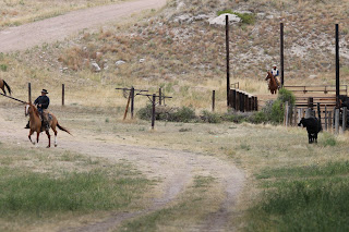 Too late. Here comes My Cowboy - acting all uninterested. Looking away from the erring youngster... But he's not uninterested. Oh no, he's not. Its all part of an act. He wants the calf to think he's not paying attention, so he can slip in front of him, and catch him off guard.