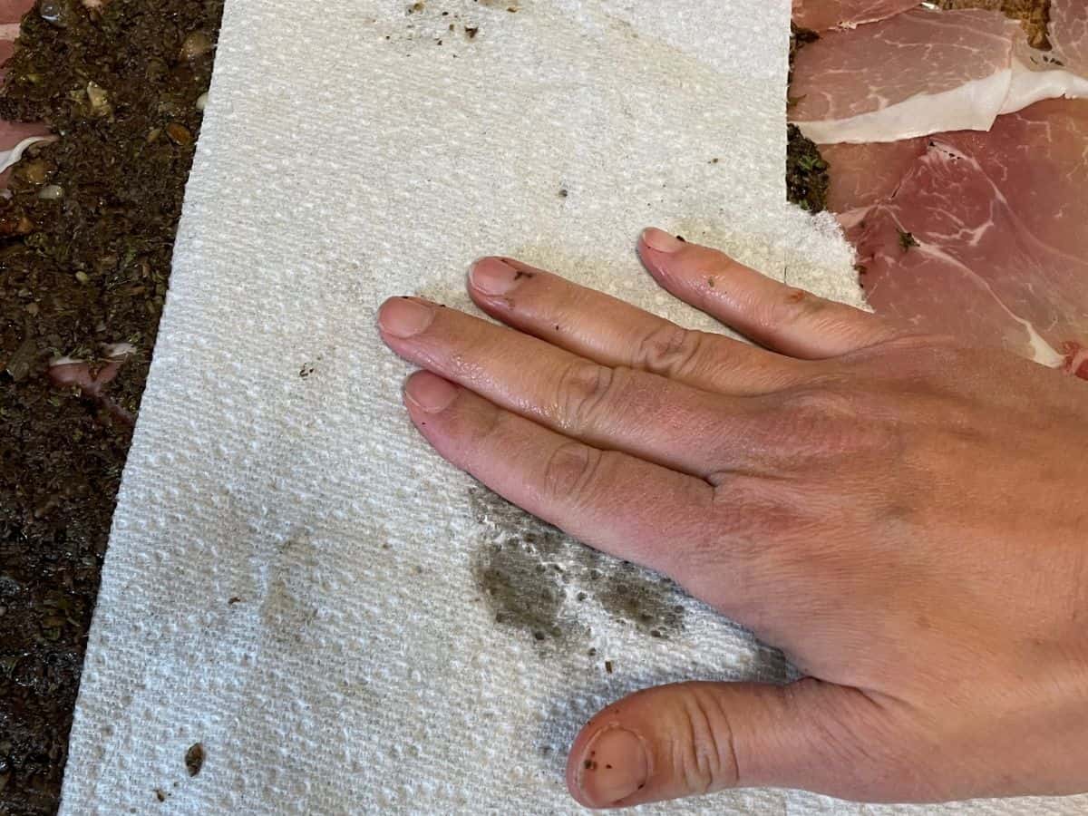 - Place two sheets of cling wrap on the counter, overlapping a bit, to make a large rectangle. Place prosciutto on the plastic. Spread the mushroom mixture on the prosciutto. If the mushrooms seem a bit too wet or soggy, take a paper towel and press it against the mushrooms, to soak up any excess moisture. Toss paper towel.