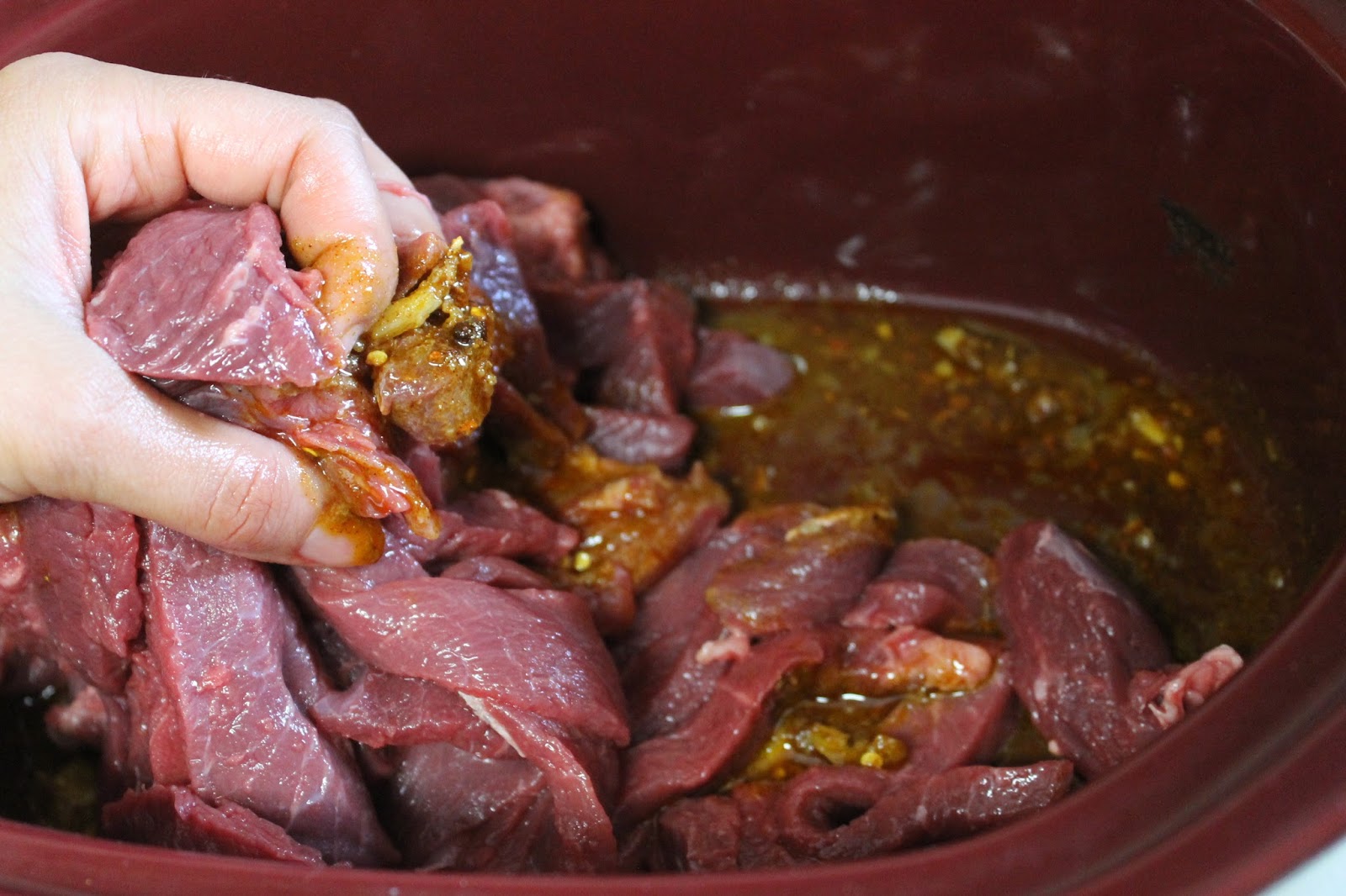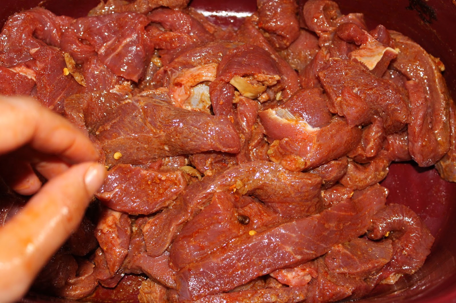 Slice the venison into thin strips. Thinner is better. I use elk or venison steak, usually. You can also use beef! Beef will not take quite as long to cook. Then throw the strips in with the spices, and mix well with your hands.
