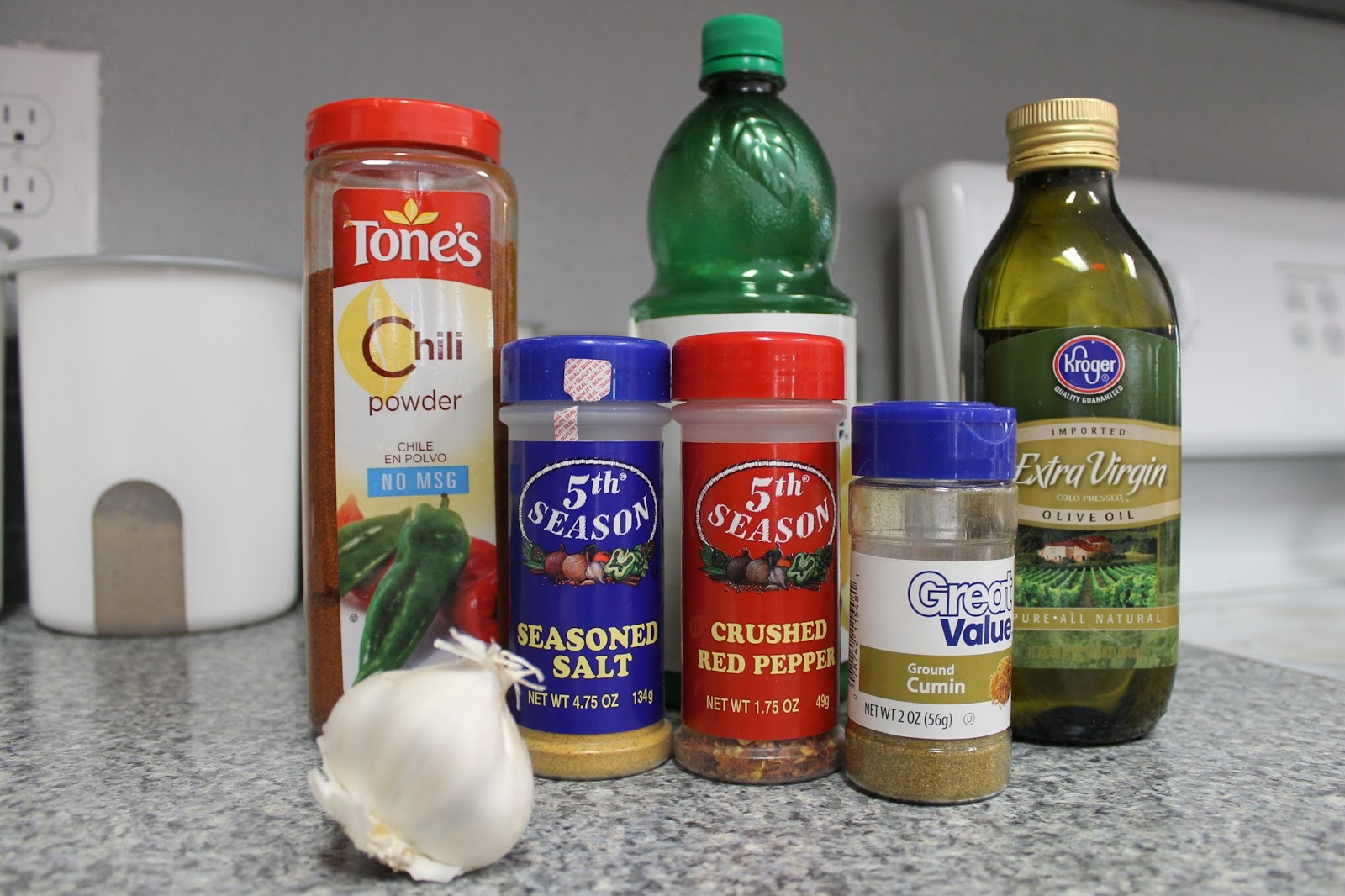 Here are the spices and such, that you will need. Note, I used bottled lemon juice, which works just fine. But you can use fresh lemon or lime juice too. Any kind of oil will work, remember the first rule of cooking from scratch: use what you have! 🙂