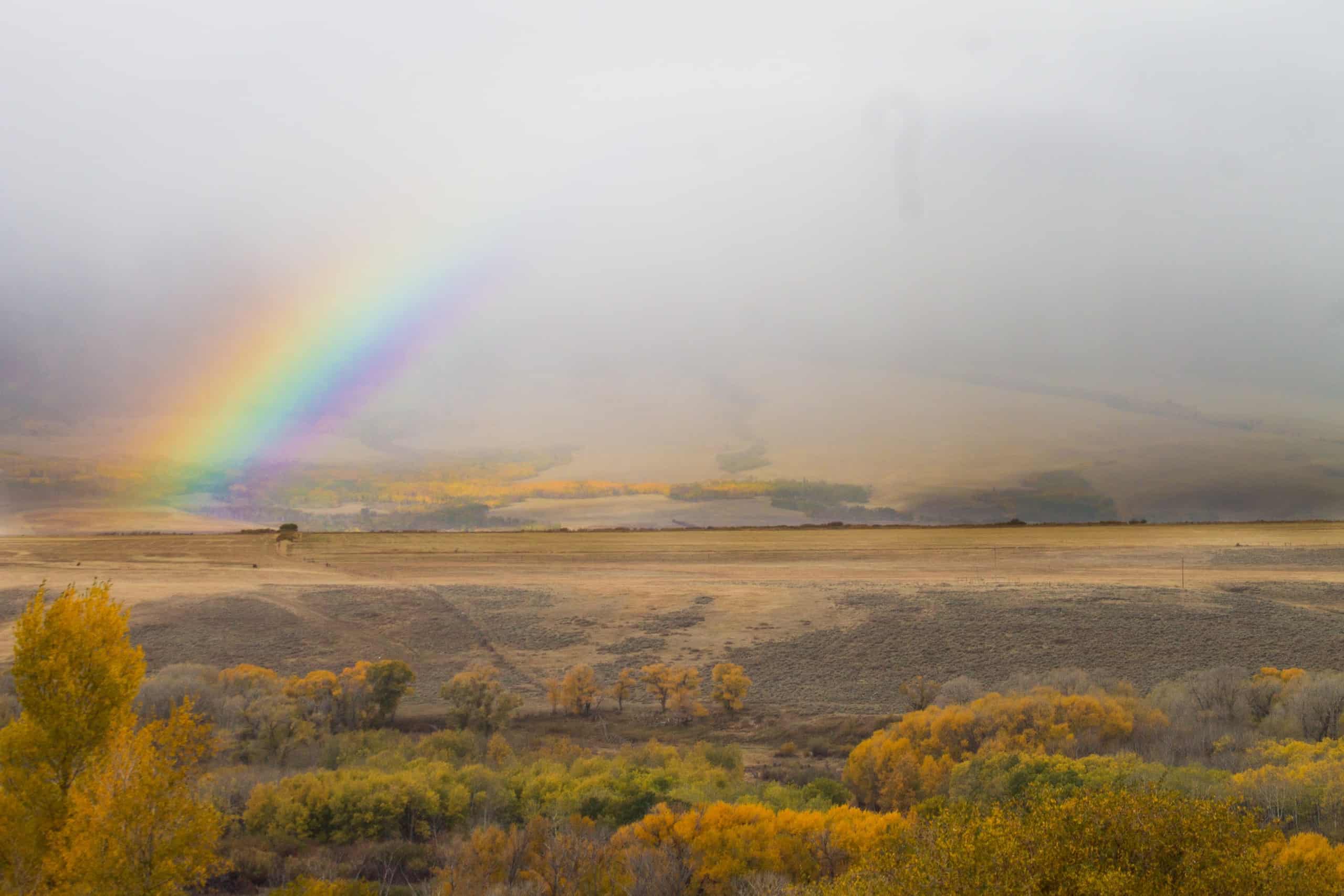 One day, it was raining and snowing by turn, clouds and fog and all sorts of drizzly. I was driving the 5 miles to our Post Office when I spied this gorgeous rainbow over by the mountain. Thankfully, I had my camera, so I pulled over and snapped a few photos. It was so beautiful! Just a sliver of rainbow dropping out of the low-rolling clouds, colors as bright as could be.