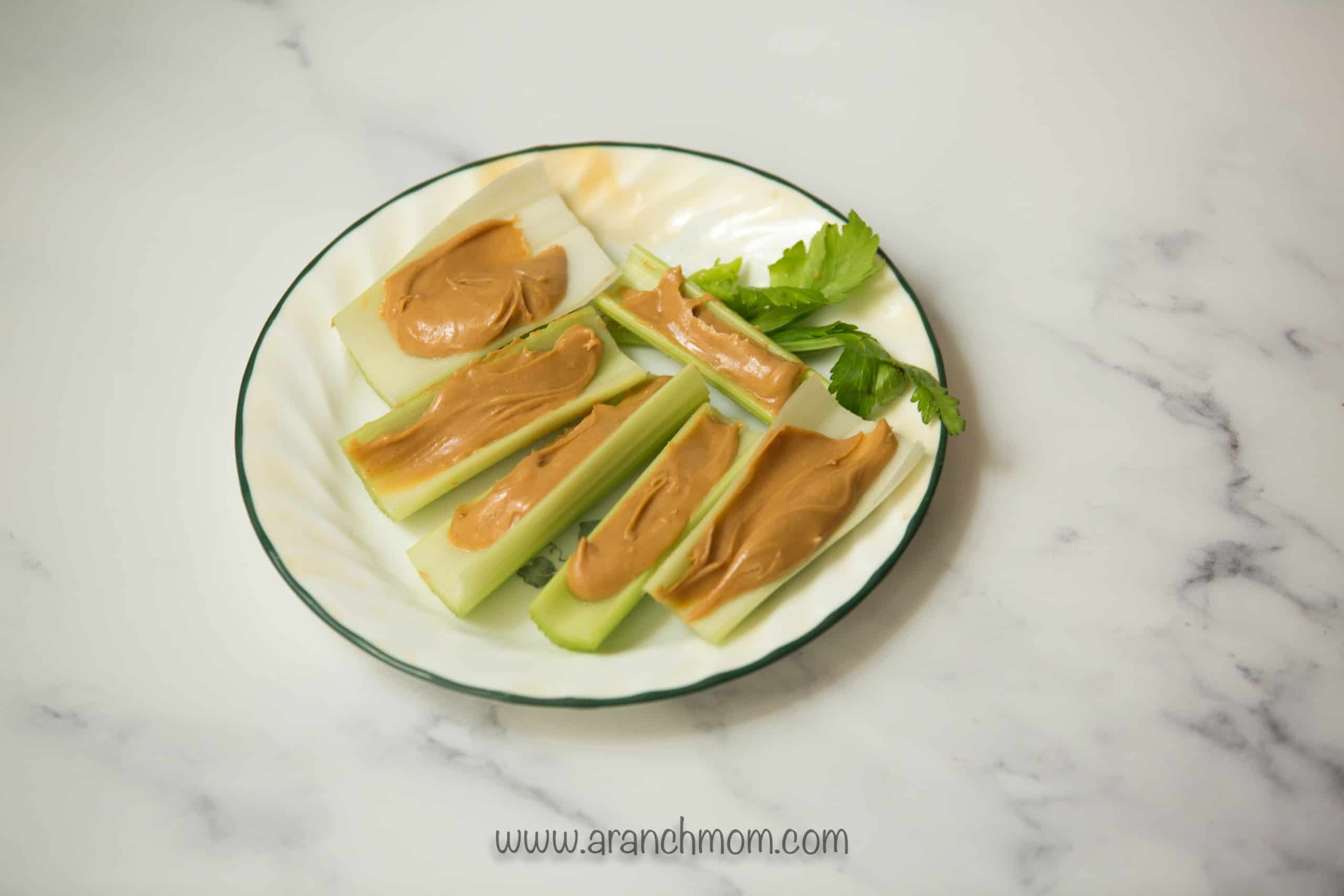 This is a staple from my childhood! Spread peanut butter into the celery ribs for a fun retro snack. Add raisins on top if that's your thing. I don't care for raisins, so I leave them off!