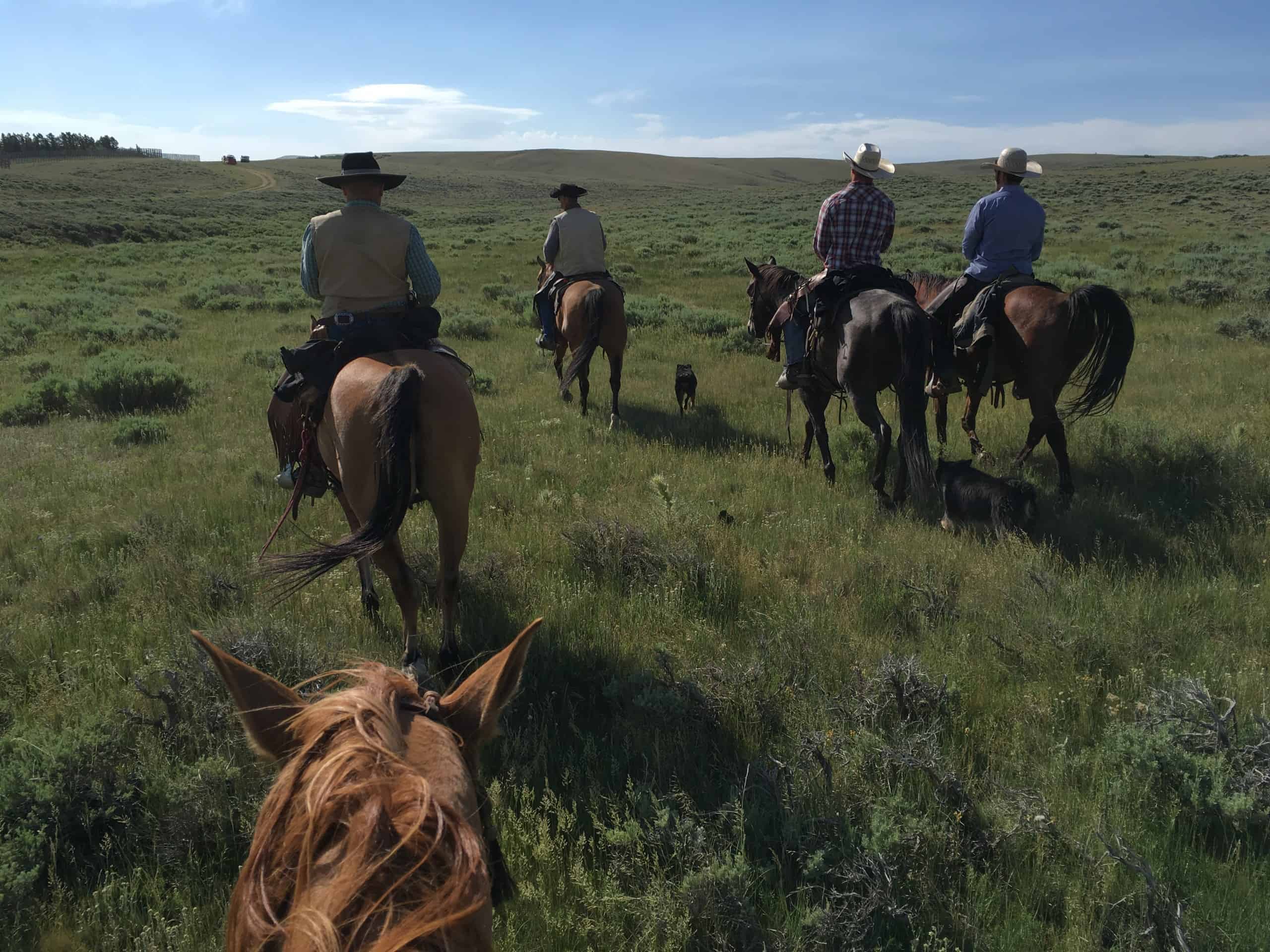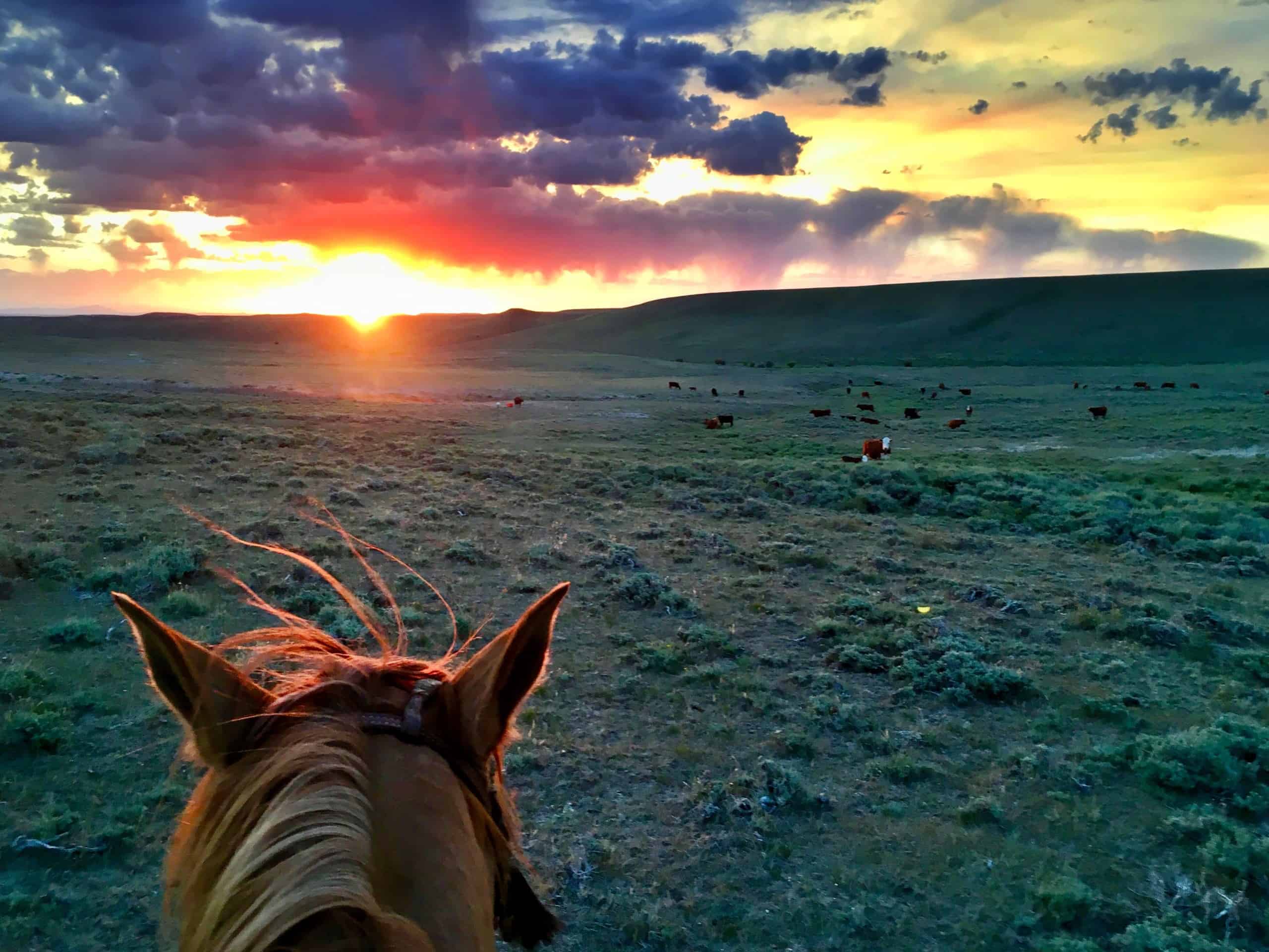 We trot our horses out across the prairie, horseshoes ringing when they hit a rock, slowly picking their way down dusty hillsides. Splashing through creeks, tails swishing at the clouds of mosquitoes, snorting at something unfamiliar - this is quickly becoming my favorite way to begin the day.