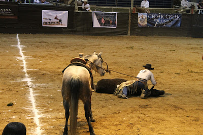 Got him down and set the ropes. All done in a relatively slow and smooth manner. I was surprised how much I enjoyed watching these events. I was fully prepared to get bored out of my head. I took books, my Ipod, and writing notebooks. But I ended up sitting in the stands with My Cowboy most of the time. Except a few times that this pregnant lady had to go eat.